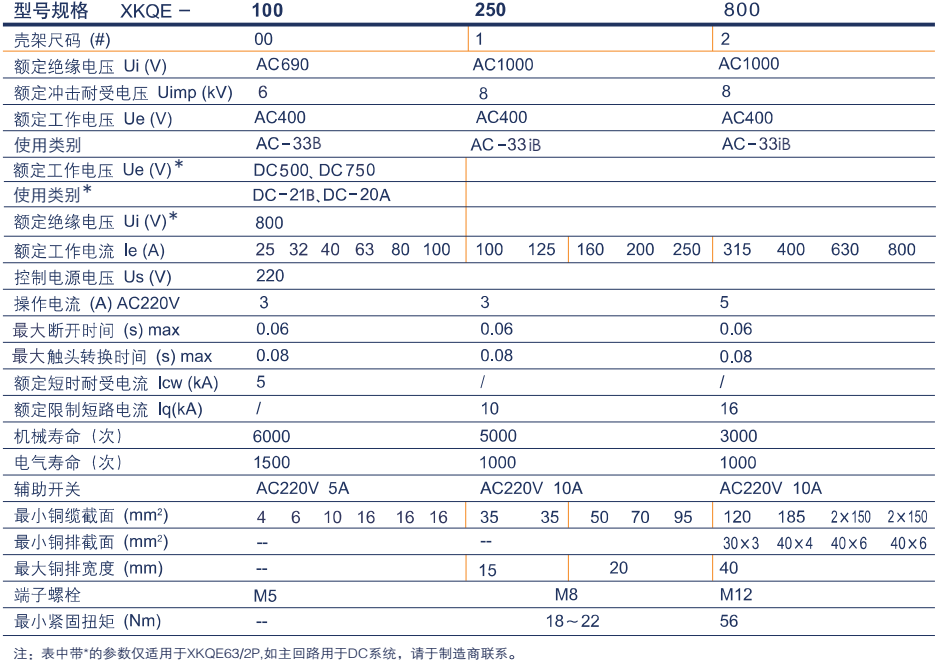 XKQE系列双电源转换开关,适用于交流50Hz,额定工作电压400V及以下,额定工作电流从25A-6000A。其适用于常用电源发生故障时,实现与备用电源或发电机的自动转换,保证重要负载的连续可靠工作。具有欠压、过压、断相等保护功能。特别适用于消防、医院、军事设备、机场、地铁、广播电视、电视枢纽、商场、化工、冶金和高层建筑等不允许断电的重要场所。