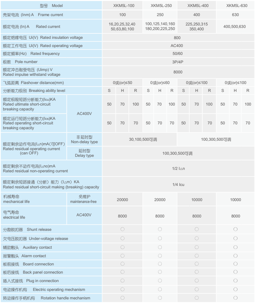 XKM5L系列塑料外壳式断路器适用于AC50/60Hz、额定绝缘电压800V、额定工作电压AC400V/690V,额定电流从16A至630A的电路中,作配电保护用,也可作为电动机保护用。